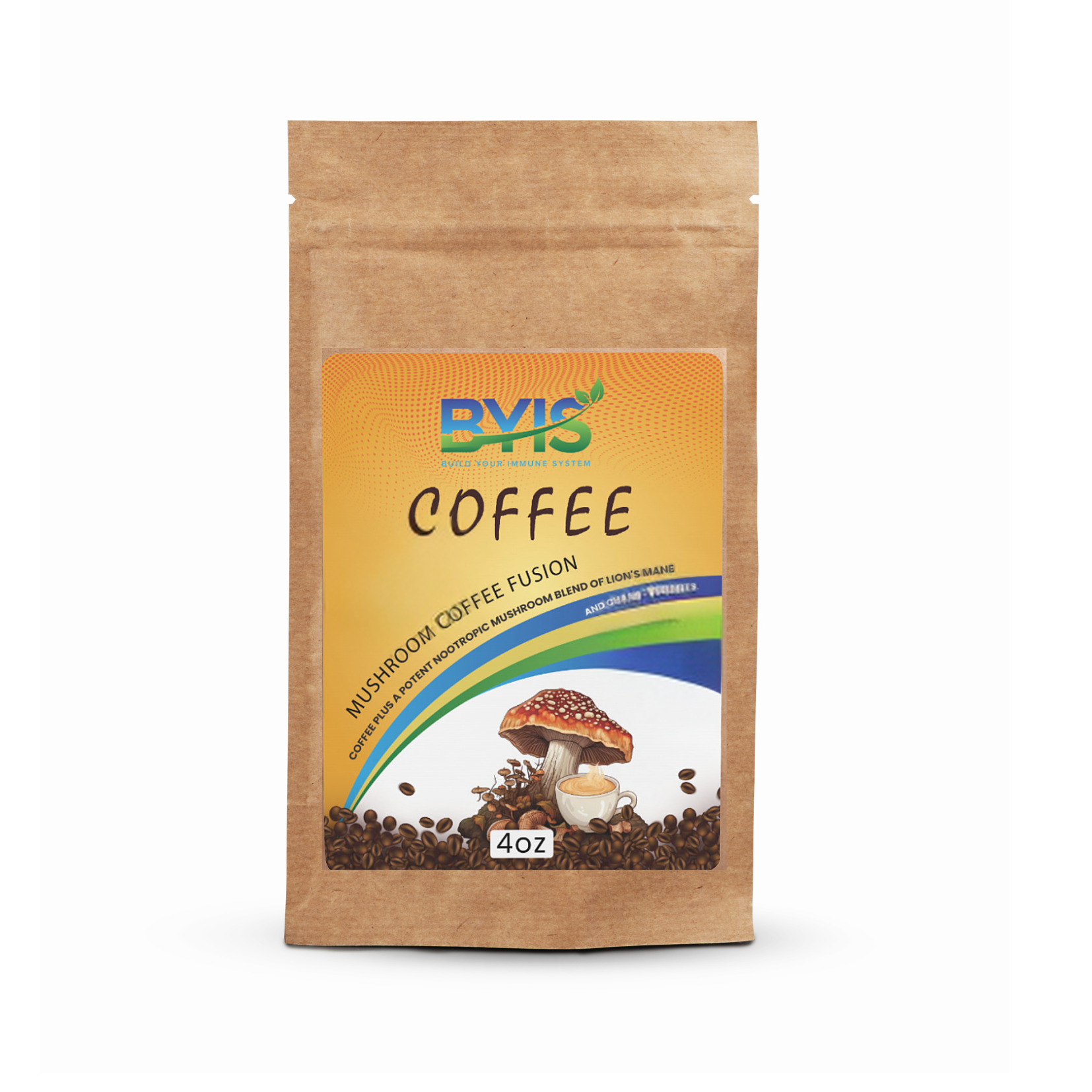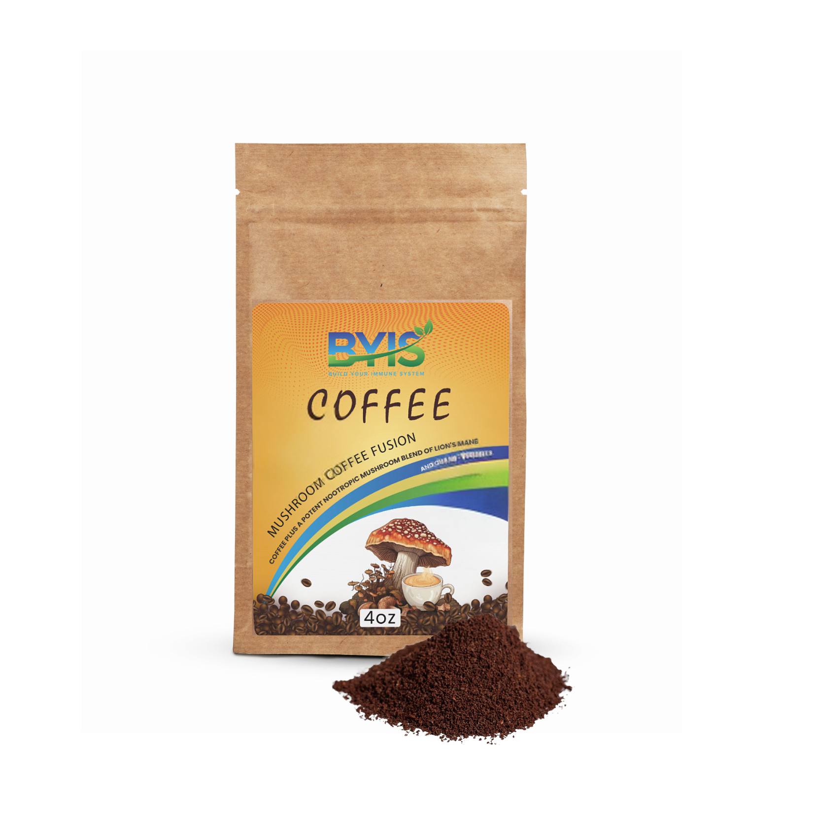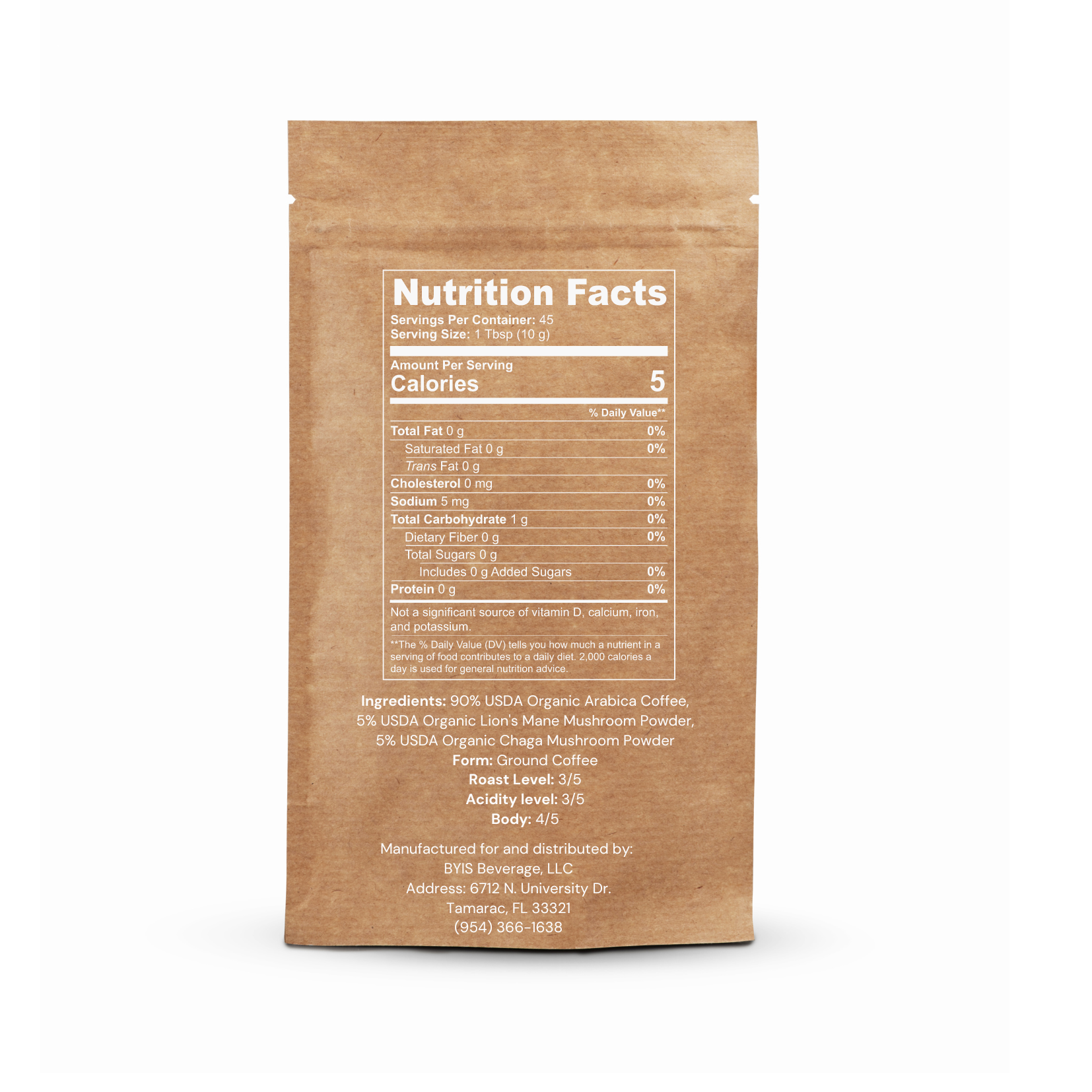 Ingredients: 90% USDA Organic Arabica Coffee, 5% USDA Organic Lion's Mane Mushroom Powder, 5% USDA Organic Chaga Mushroom Powder.